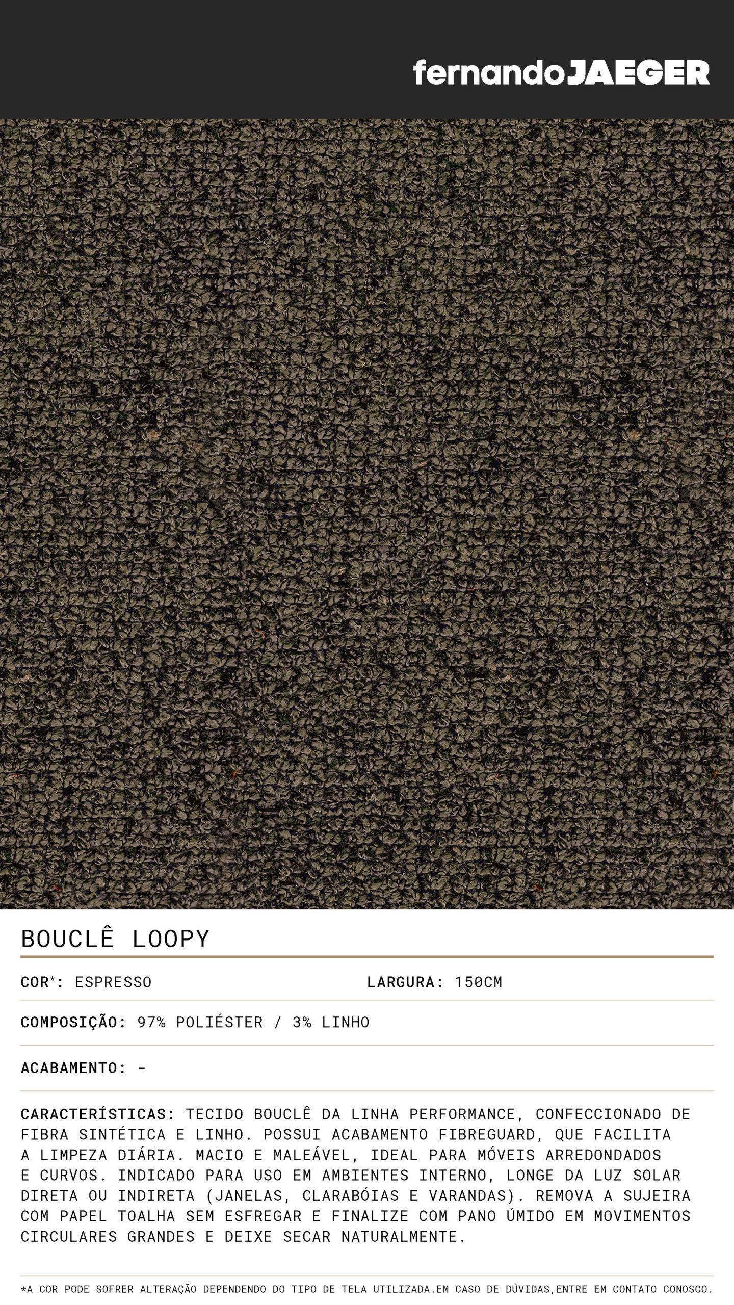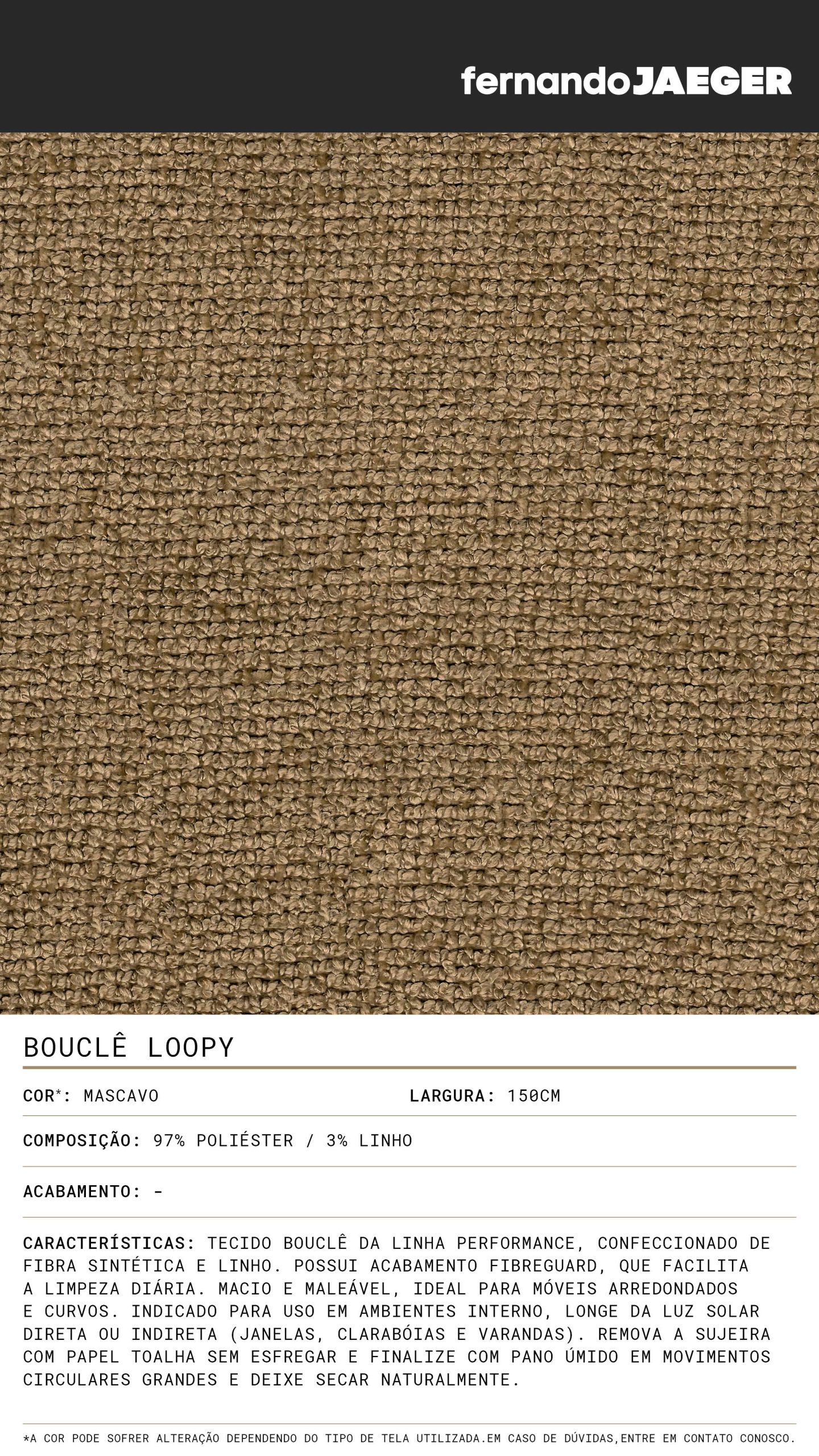 Tecido bouclê da linha Performance, confeccionado de fibra sintética e linho. Possui acabamento FibreGuard, que facilita a limpeza diária. Macio e maleável, ideal para móveis arredondados e curvos. Indicado para uso em ambientes interno, longe da luz solar direta ou indireta.(janelas, clarabóias e varandas). Remova a sujeira com papel toalha sem esfregar e finalize c/ pano úmido em movimentos circulares grandes e deixe secar naturalmente.