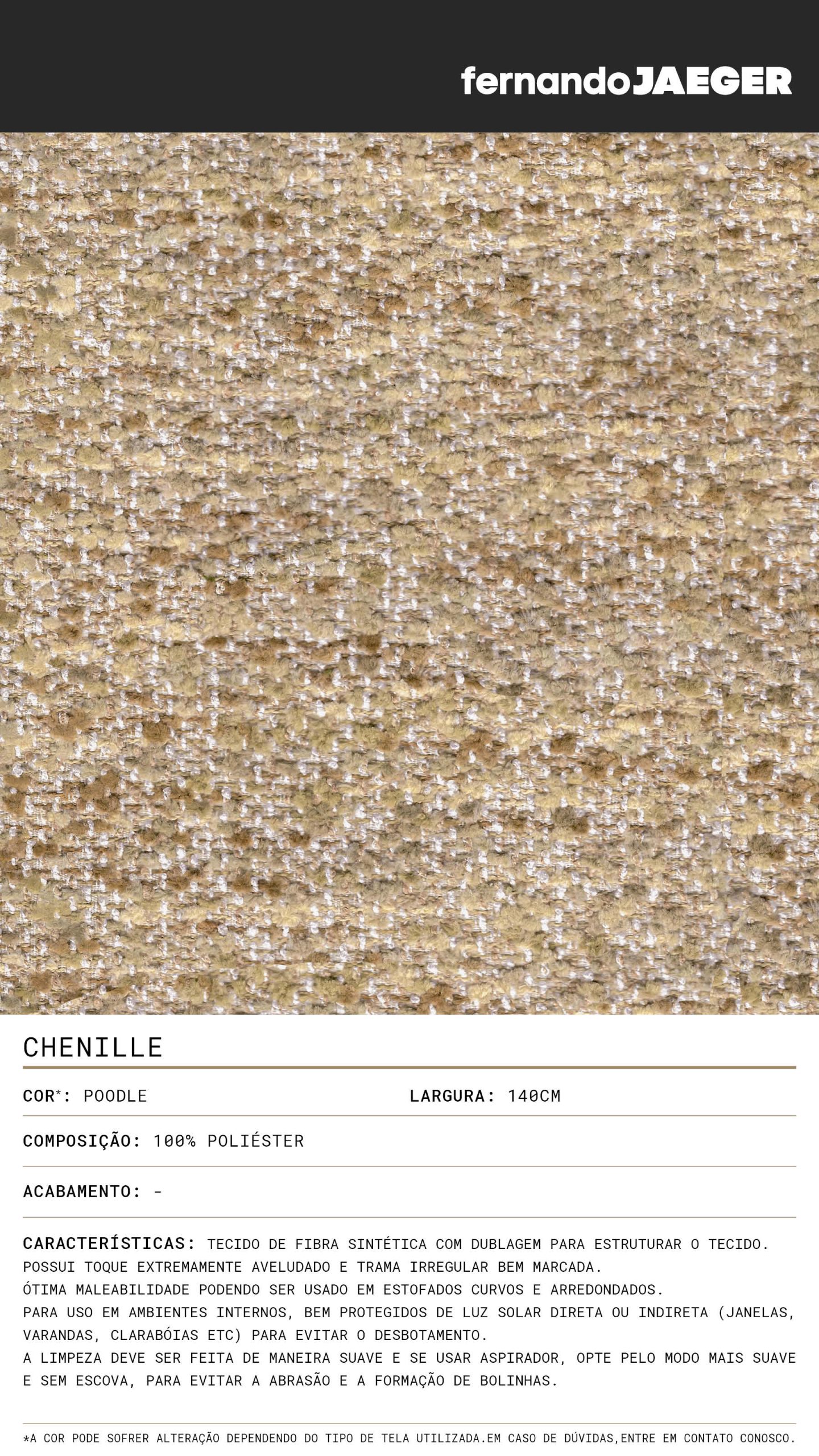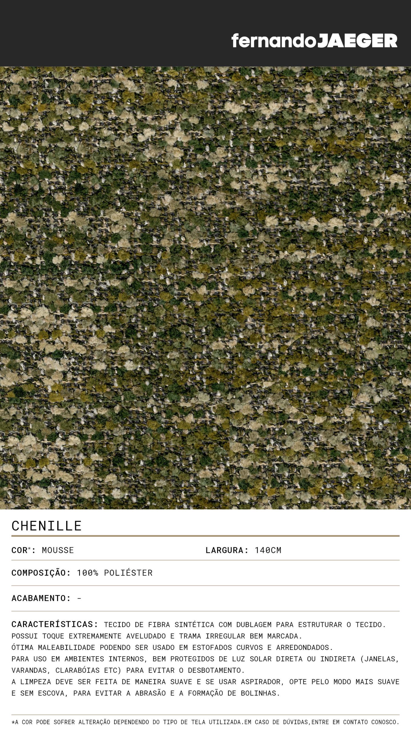 Tecido de fibra sintética com dublagem para estruturar o tecido. Possui toque extremamente aveludado e trama irregular bem marcada. Ótima maleabilidade podendo ser usado em estofados curvos e arredondados. Para uso em ambientes internos, bem protegidos de luz solar direta ou indireta (janelas, varandas, clarabóias etc) para evitar o desbotamento. A limpeza deve ser feita de maneira suave e se usar aspirador, opte pelo modo mais suave e sem escova, para evitar a abrasão e a formação de bolinhas.
