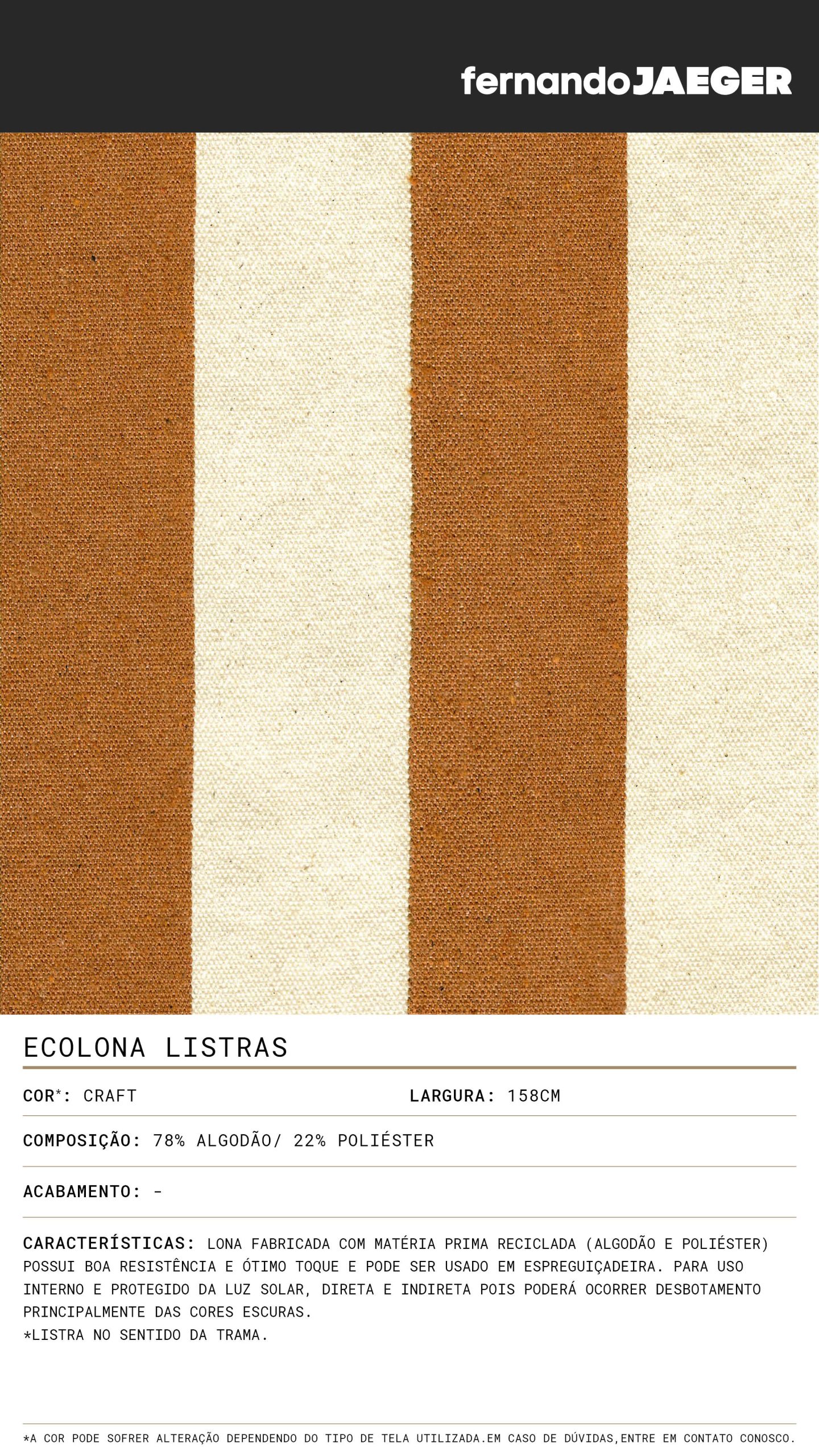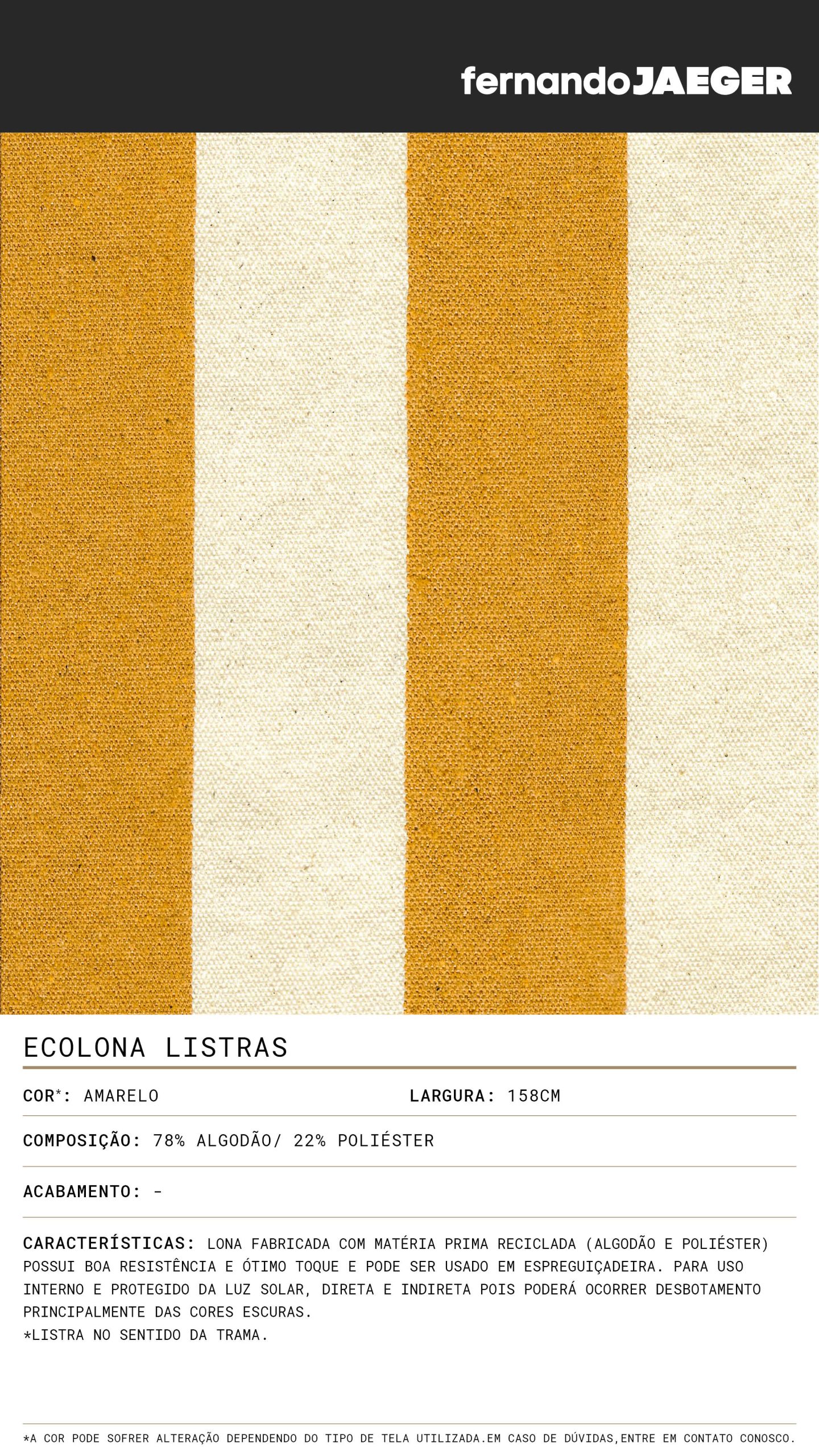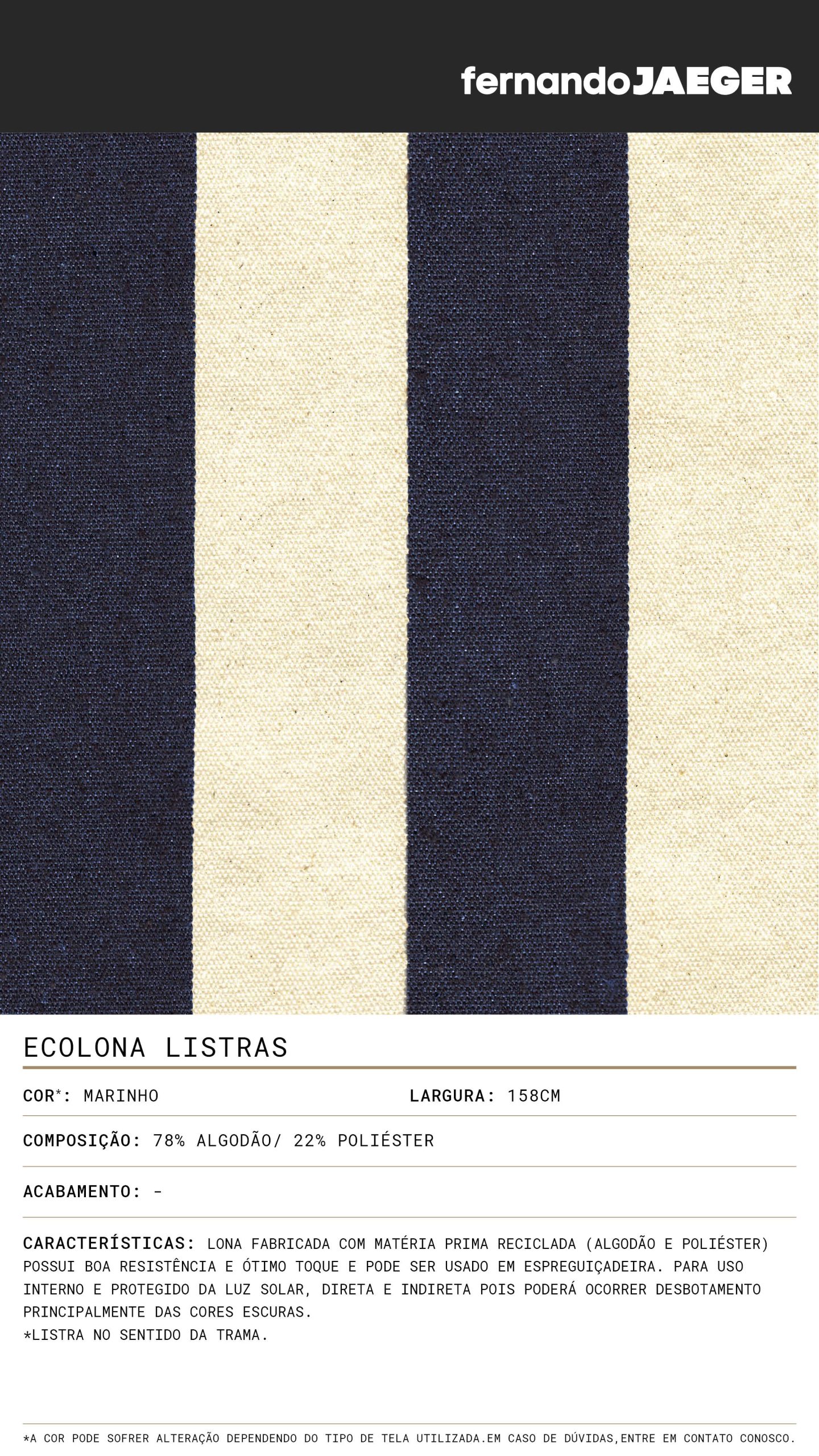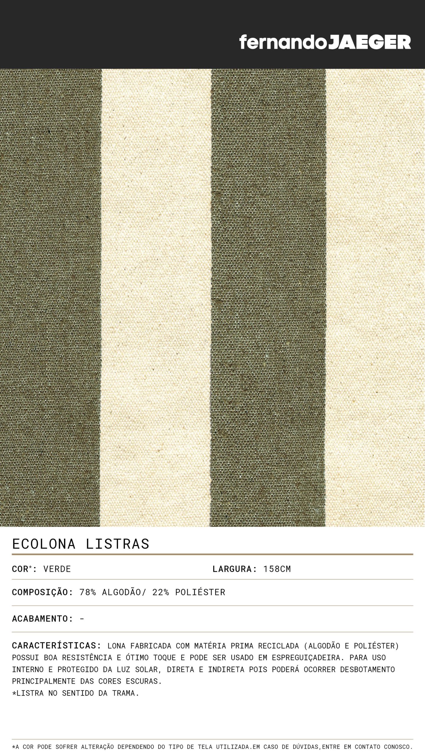 Lona fabricada com matéria prima reciclada (algodão e poliéster) possui boa resistência e ótimo toque e pode ser usado em espreguiçadeira. Para uso interno e protegido da luz solar, direta e indireta pois poderá ocorrer desbotamento principalmente das cores escuras.