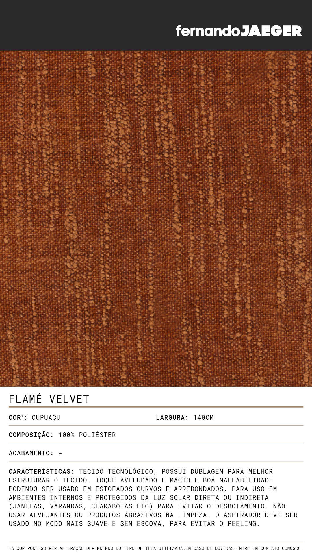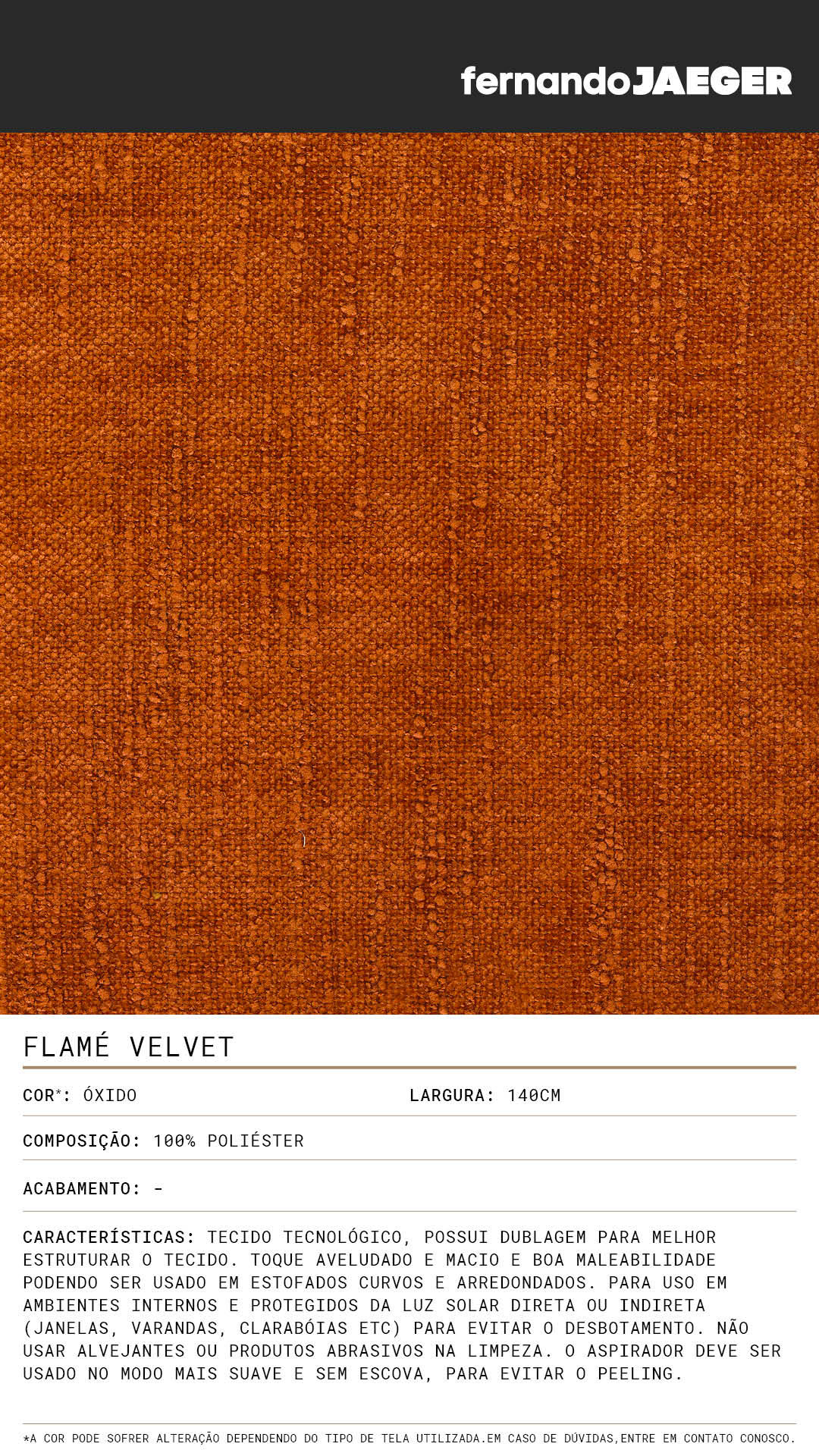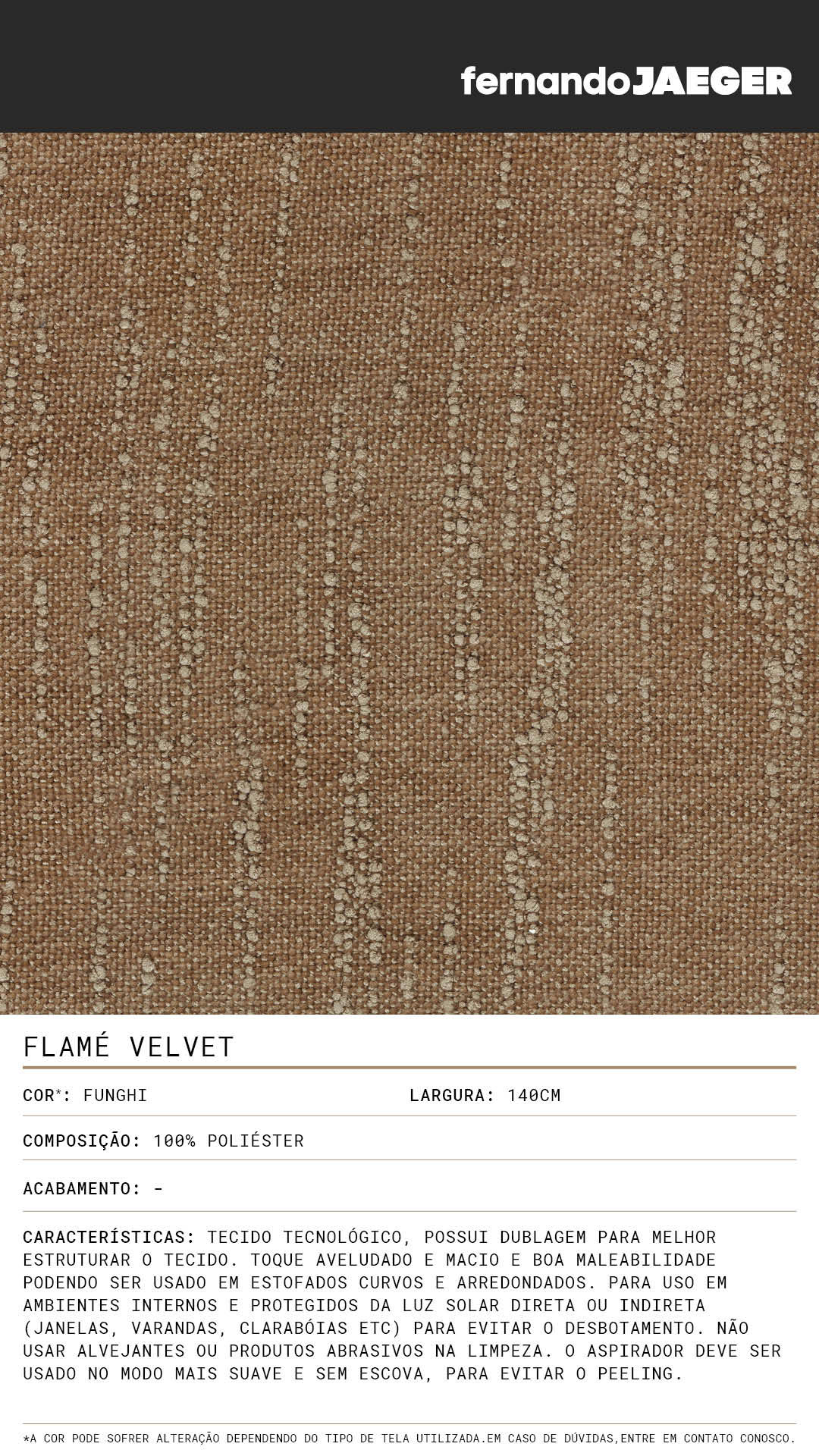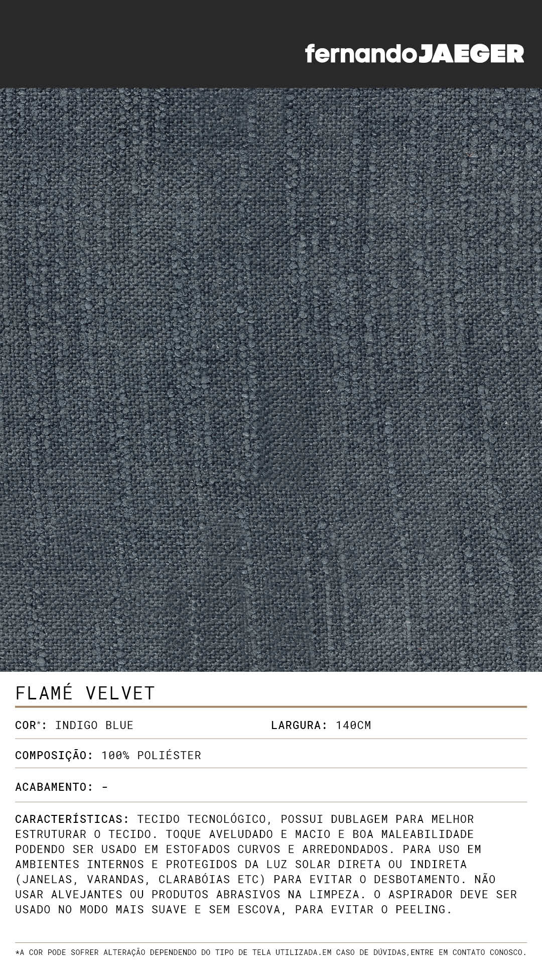 Tecido tecnológico, possui dublagem para melhor estruturar o tecido. Toque aveludado e macio e boa maleabilidade podendo ser usado em estofados curvos e arredondados. Para uso em ambientes internos e protegidos da luz solar direta ou indireta (janelas, varandas, clarabóias etc) para evitar o desbotamento. Não usar alvejantes ou produtos abrasivos na limpeza. O aspirador deve ser usado no modo mais suave e sem escova, para evitar o peeling.