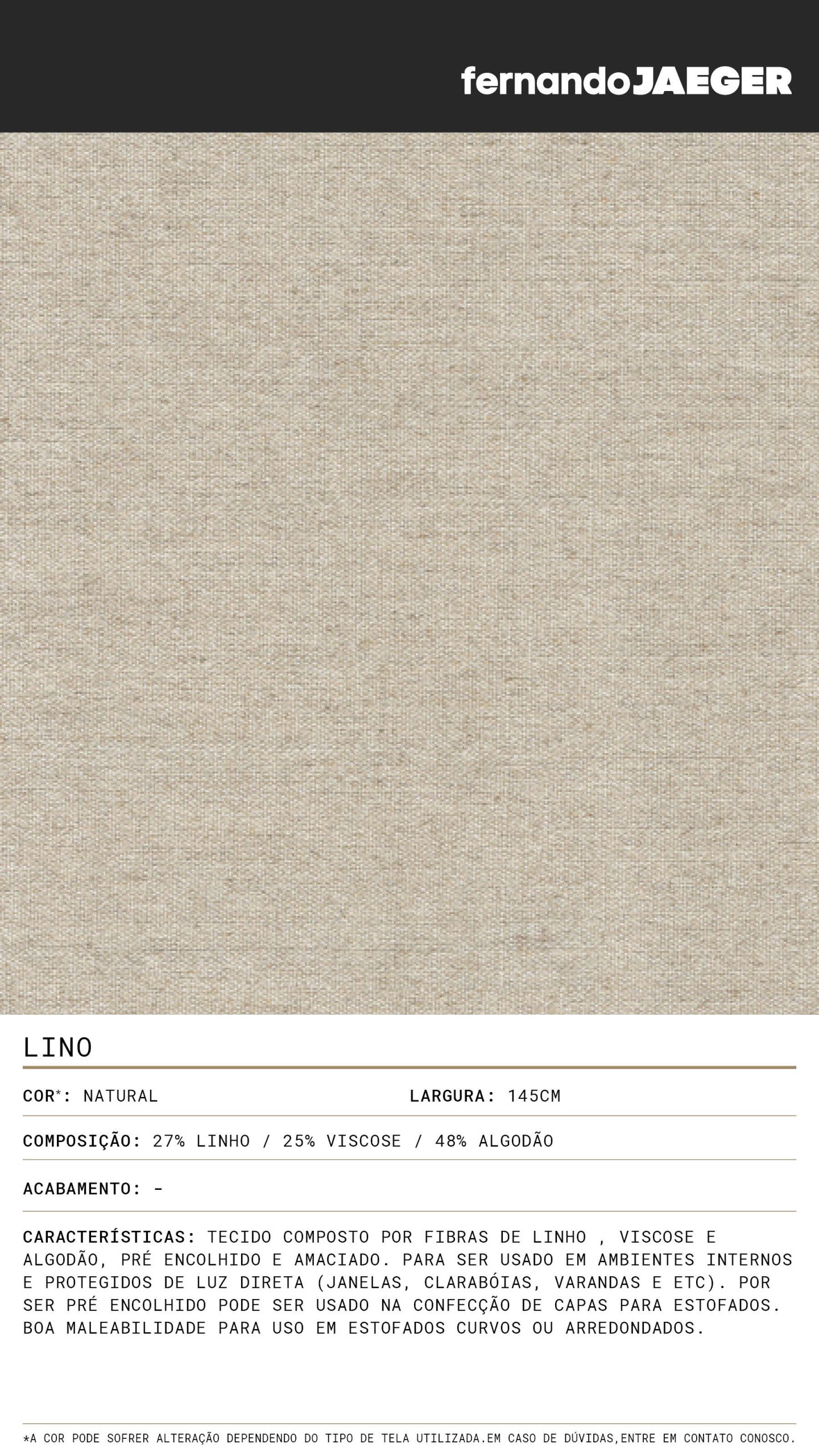Tecido composto por fibras de linho , viscose e algodão, pré encolhido e amaciado. Para ser usado em ambientes internos e protegidos de luz direta (janelas, clarabóias, varandas e etc). Por ser pré encolhido pode ser usado na confecção de capas para estofados. Boa maleabilidade para uso em estofados curvos ou arredondados.