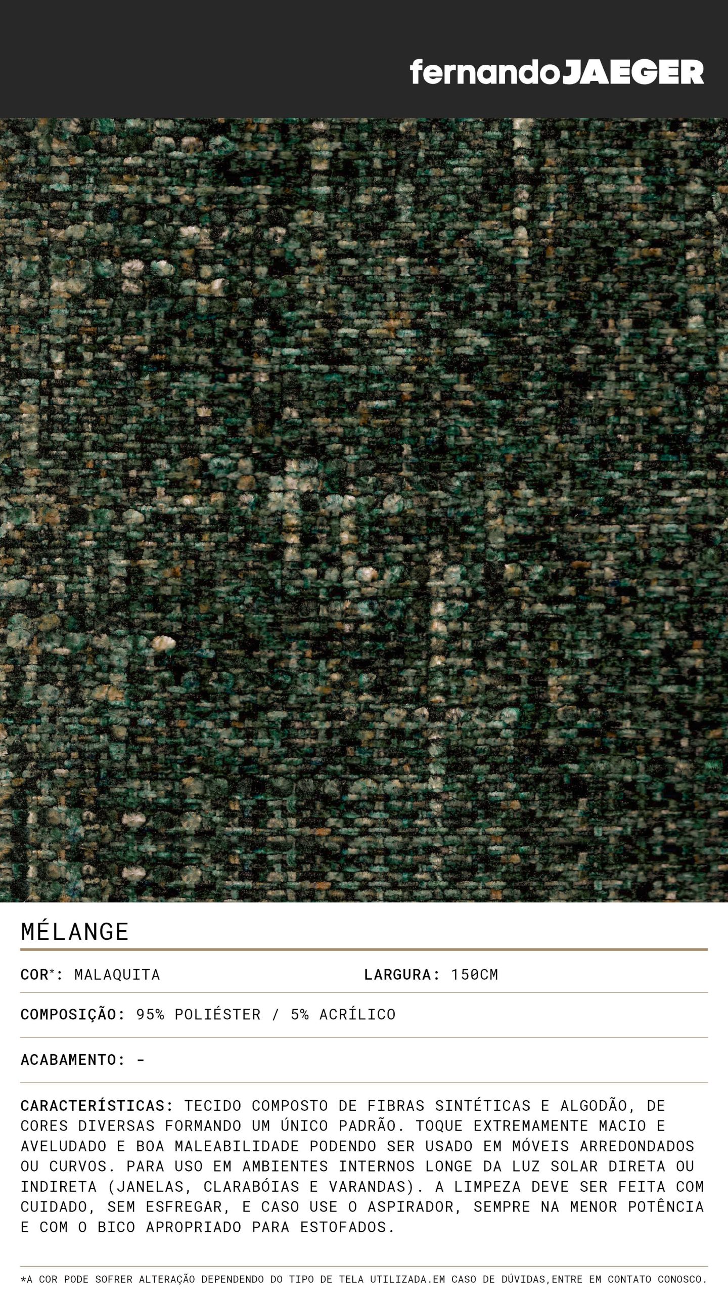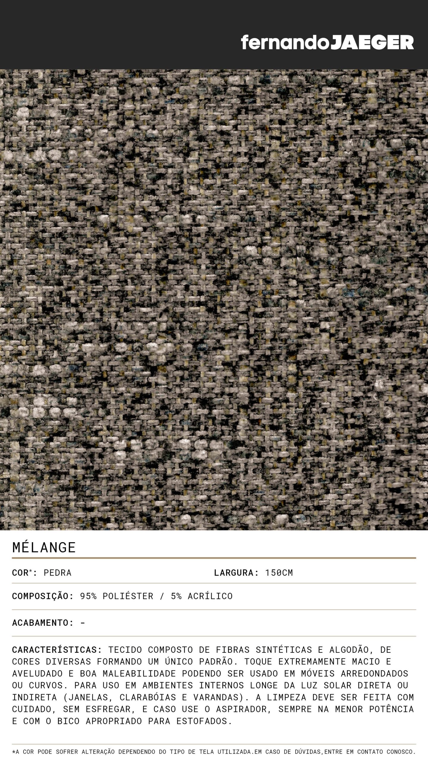 Tecido composto de fibras sintéticas e algodão, de cores diversas formando um único padrão. Toque extremamente macio e aveludado e boa maleabilidade podendo ser usado em móveis arredondados ou curvos. Para uso em ambientes internos longe da luz solar direta ou indireta (janelas, clarabóias e varandas). A limpeza deve ser feita com cuidado, sem esfregar, e caso use o aspirador, sempre na menor potência e com o bico apropriado para estofados.