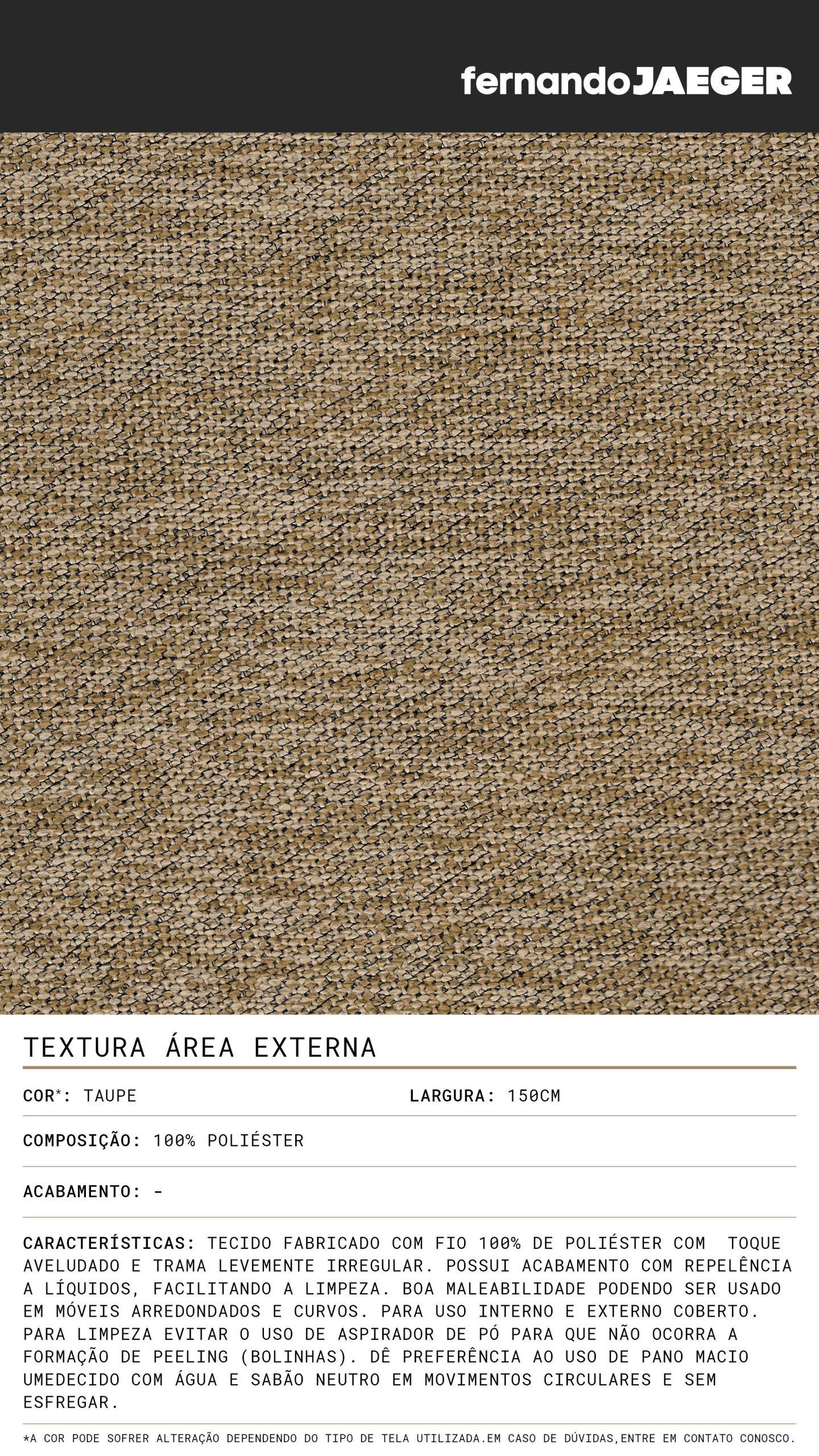 Tecido fabricado com fio 100% de poliéster com toque aveludado e trama levemente irregular. Possui acabamento com repelência a líquidos, facilitando a limpeza. Boa maleabilidade podendo ser usado em móveis arredondados e curvos. Para uso interno e externo coberto. Para limpeza evitar o uso de aspirador de pó para que não ocorra a formação de peeling (bolinhas). Dê preferência ao uso de pano macio umedecido com água e sabão neutro em movimentos circulares e sem esfregar.