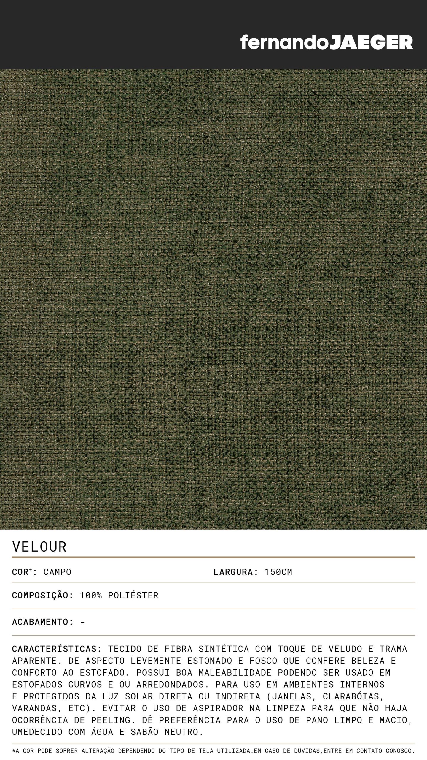 Tecido de fibra sintética com toque de veludo e trama aparente. De aspecto levemente estonado e fosco que confere beleza e conforto ao estofado. Possui boa maleabilidade podendo ser usado em estofados curvos e ou arredondados. Para uso em ambientes internos e protegidos da luz solar direta ou indireta (janelas, clarabóias, varandas, etc). Evitar o uso de aspirador na limpeza para que não haja ocorrência de peeling. Dê preferência para o uso de pano limpo e macio, umedecido com água e sabão neutro.